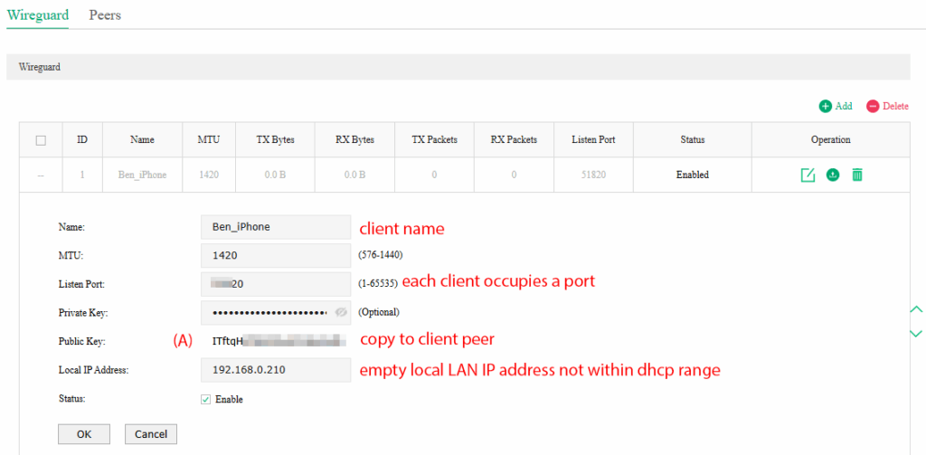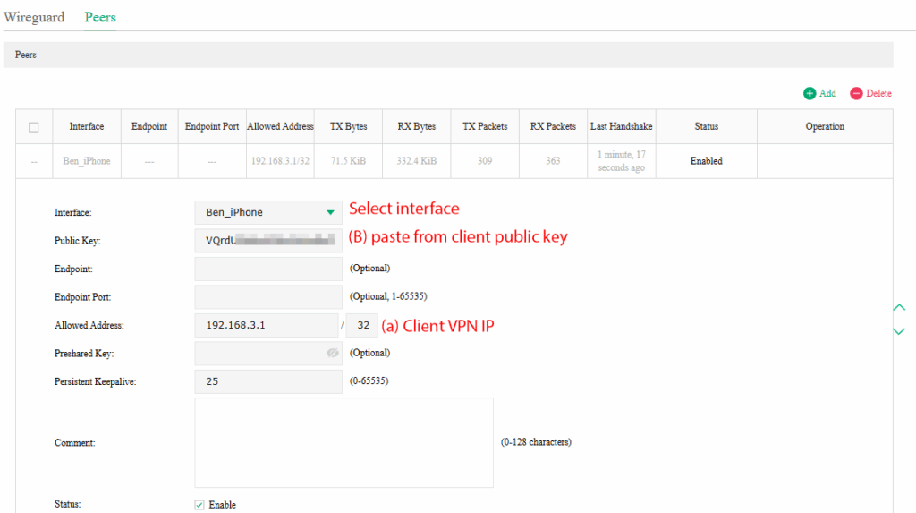 Back to the Web GUI, paste the client’s Public key (B). Then fill the necessary details for the rest of the blanks.