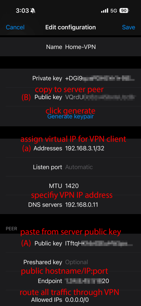 In the app, choose “Create from scratch”, then scroll down and select “Add peer.” Under the PEER section, paste the server’s Public Key (A) that you copied earlier. Fill in the rest of the configuration details as needed.