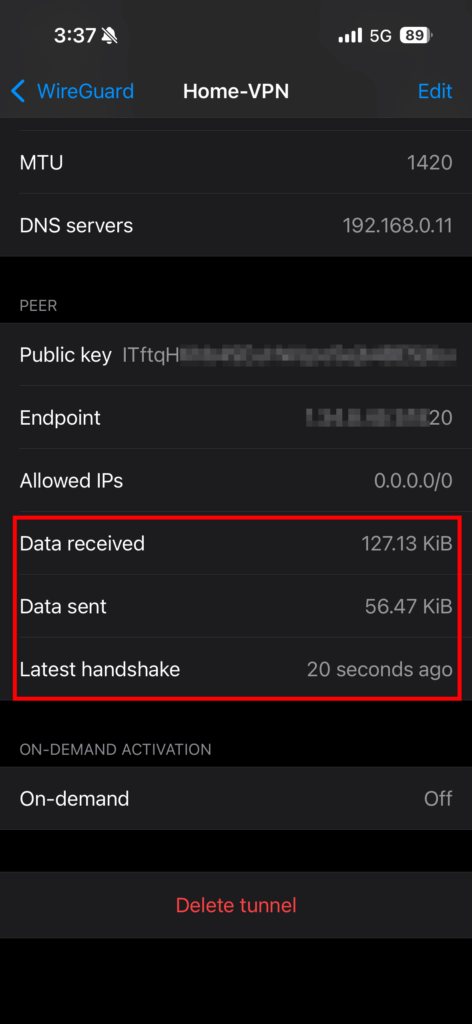 Once the peer configuration is complete, you can test the connection from the client device. If you see data activity, then your WireGuard VPN is up and running!